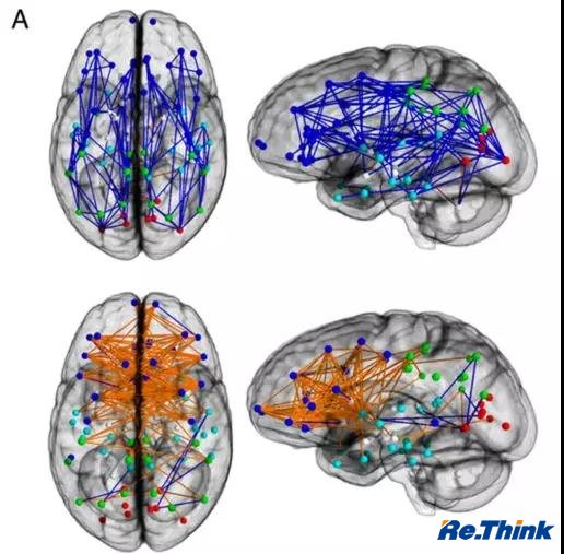 上方是男性的腦,下方是女性的腦。女性的胼胝體(連接兩個(gè)腦半球百萬(wàn)以上的纖維束)比較厚,女性大腦左右半球的連接網(wǎng)絡(luò )通常很密集,而男性大腦兩個(gè)半球間卻鮮能觀(guān)察到互聯(lián)互通。